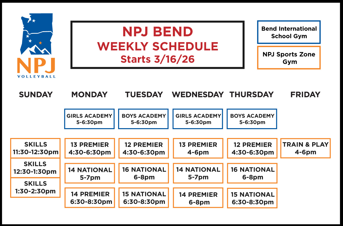 NPJ Bend is our location in the heart of the Cascade Mountains, and it houses some of the best players in the central and south Oregon areas. The Bend location is run by NPJ Bend Club Director & NPJ Beach Director - Colton Naill & NPJ Bend Assistant Club Director & NPJ Sports Zone Building Manager - Olivia Irving and hosts top teams in the CEVA Region and Nationally at all age groups.